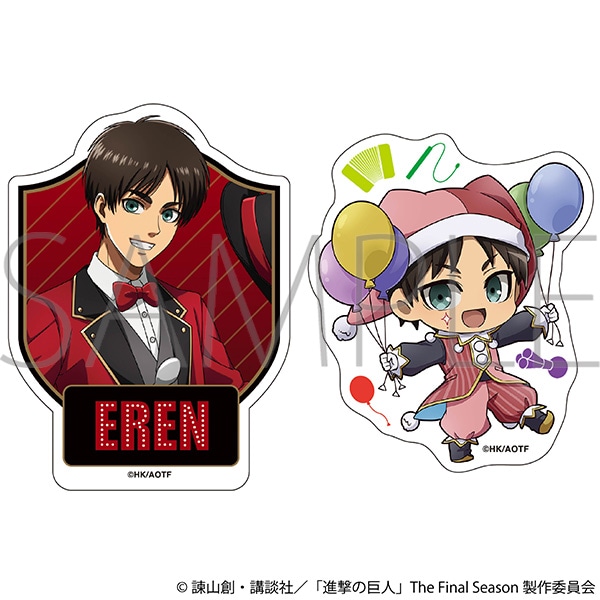 TVアニメ『進撃の巨人』より、煌びやかなマジシャンと可愛いピエロの衣装に身を包んだエレンがセットになったステッカーセットが登壇!用途に合わせて選べる嬉しい2枚セットです。